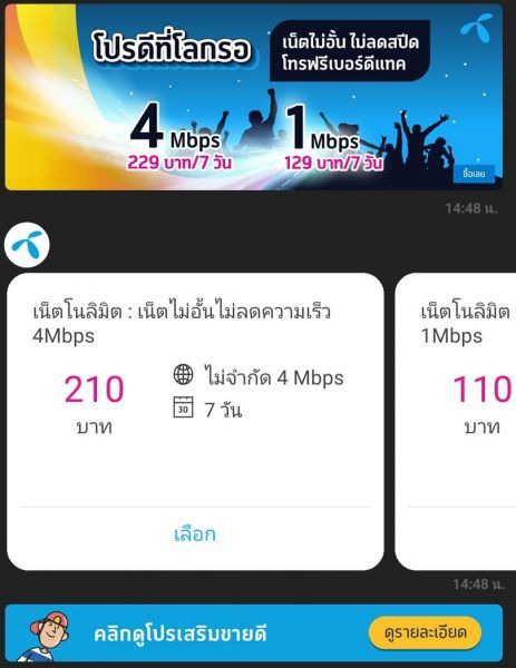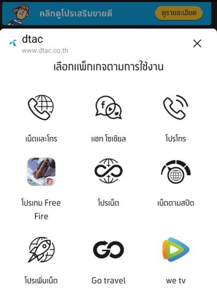 ในเมนูนี้จะเป็นการดูโปรสุดพิเศษต่างๆ ที่เราสามารถสมัครเพิ่มเติมจากโปรหลักได้ ซึ่งมีให้เลือกทั้งโปรเพิ่มเน็ต, เพิ่มโทร, Go travel (ซื้อเน็ตไปต่างประเทศ) และอื่นๆ ครบจบที่เดียว ไม่ต้องเสียเวลาไปเปิดเว็บไซต์ให้ยุ่งยาก