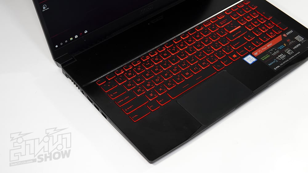 แป้นคีย์บอร์ดเป็นขนาด Full Size มาตรฐาน มี Numpad มาให้เรียบร้อย โดยตัวไฟคีย์บอร์ดจะเป็นสีแดง ปรับความสว่างได้ 3 ระดับ ตัดกับตัวเครื่องสีดำให้ความรู้สึกที่ดุดัน และเป็นสีที่แสดงเอกลักษณ์ความเป็น MSI ได้อย่างสวยงาม ตัวคีย์กดให้ความรู้สึกค่อนข้างดี ทั้งในการพิมพ์และการเล่นเกม และด้านล่างจะเป็นบริเวณของ Trackpad ขนาดใหญ่ ซึ่งตัว Top ของคีย์บอร์ดก็เป็นวัสดุอลูมิเนียมขัดเงาด้วยเช่นกัน