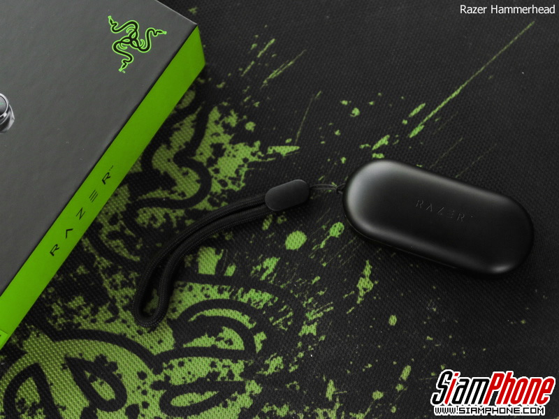 กล่องเก็บหูฟังของ Razer Hammerhead เป็นวัสดุพลาสติกแบบด้าน สีดำ ด้านบนสลักชื่อ RAZER