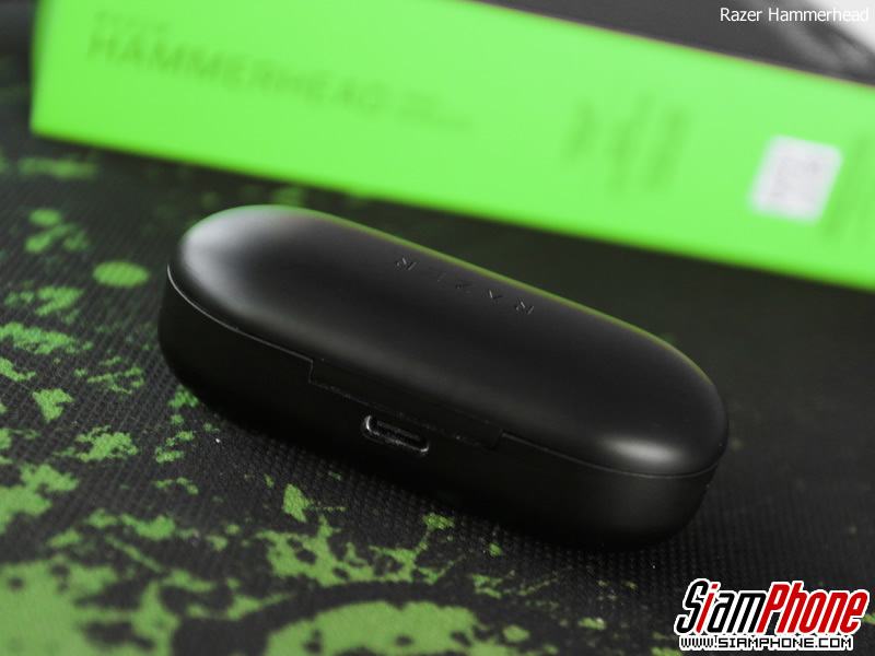 ด้านในของกล่องเมื่อเปิดฝาจะเป็นช่องสำหรับเก็บและชาร์จหูฟัง และในฝานั้นจะมียางนุ่มๆ ที่สลักชื่อ Razer ไว้