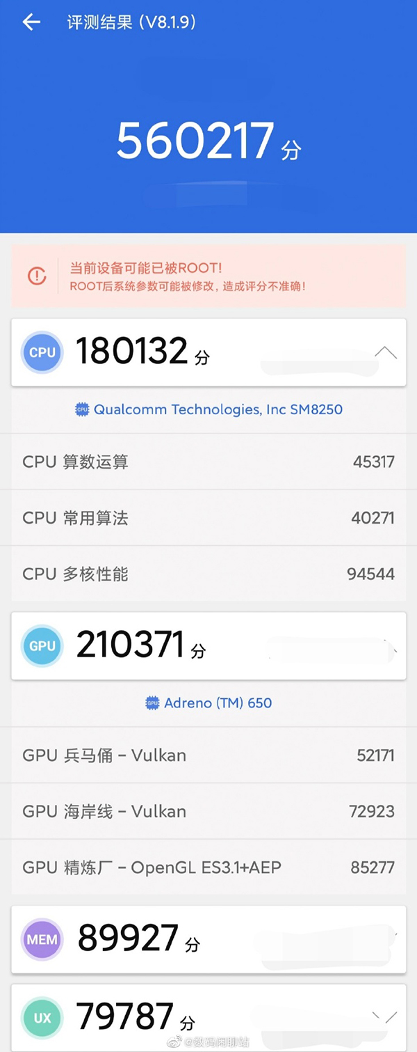 นอกจากนี้ คะแนนของ AnTuTu ยังทำไปได้ถึง 560,217 คะแนน โดยขับเคลื่อนด้วยหน่วยประมวลผล Qualcomm SM8250 หรือ Snapdragon 865 ควบคู่กับ GPU Adreno 650